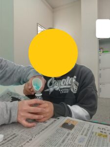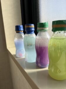 次は、色付けです。ボトルに水を入れて絵具を入れました。