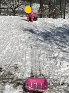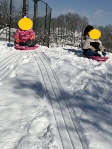 昨日の雪がまだ残っていたので、そりや雪で遊びました。