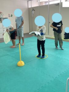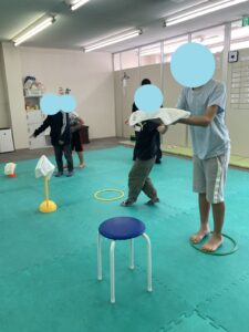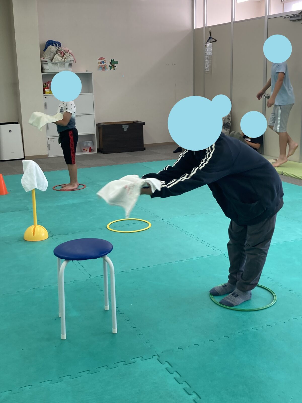 三角コーンや丸椅子にふわっとタオルをかけます。