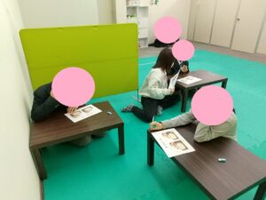 みんなで協力して間違いを7つみつけますが、一人ずつ離れた場所で間違い探しプリントに取り組みます。なので、間違いがあった場所をお友だちに共有するには『言葉』で伝えます🎵