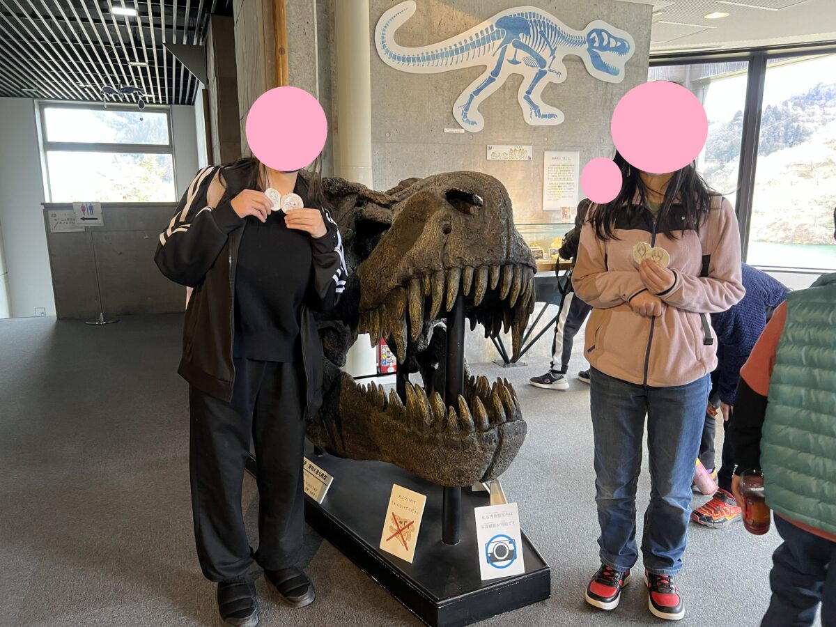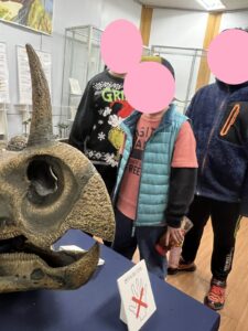 恐竜の頭蓋骨から、どこに鼻や目のがあったのか想像しているお兄さんたちもいました🔍