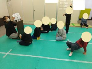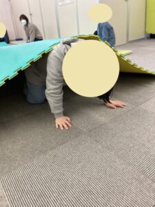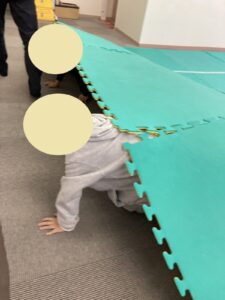 身体を守るための1つとして、マットの下に潜る訓練(今回は通り抜け)をしました。