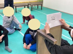 運動あそびの後は避難訓練(地震)を行いました。