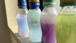 昨日とは全く逆!とってもいいお天気になりました。今日は、『バイカラーボトル』づくりをしました。まずは、ボトルの中に入れる小物選びイラスト・ビーズ・カラーストーン・星などなどお友達にゆずる気持ちを持って、選んでいました。次は、色付けです。ボト...